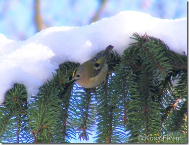 “Fenyő ághegyei közt bujkál, százszor keresed, egyszer, ha rátalálsz. (…) a madár, amelyért tűvé tesszük olykor az előttünk álló fát, “fiszt, iszt, szít, szrí, szi-szi”-szerű hangot hallat ténykedése közben. Halkan, finoman szól e hangicsálás, mégis igen alkalmas arra, hogy már-már lankadó érdeklődésünket újból és újból felcsigázza.” írta Béldi Miklós a sárgafejű királykáról, Európa legkisebb, mindössze 5-7 grammos madaráról. Fenyőerdőben fészkel, 8-10 tojást rak. A tojása “akkora mint egy öreg borsószem ” (Herman Ottó), mindössze 0,6-0,7 g. A királyka fürgén mozog a gallyak sűrűjében, gyakran függöget az ághegyek előtt. “Aranynál is hasznosabb kis jószág, mely rovarokkal, tojásukkal és álczáikkal él, leginkább a fenyvesek őre és kertésze”, írta róla Herman Ottó. Az alábbi fotókat Borszéken készítettem.