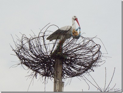 A hazafele tartó út is tartogatott még egy gólyás meglepetést: Dengeleg egyik gólyaszerető lakója egy külön állványra helyezett ki egy műgólyafészket, babát hozó műgólyával is…